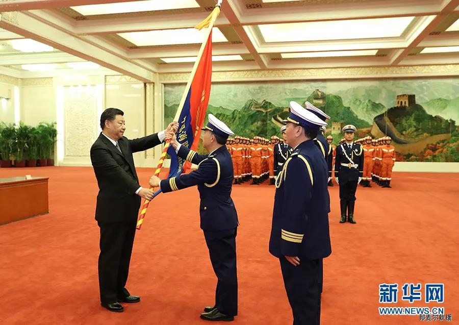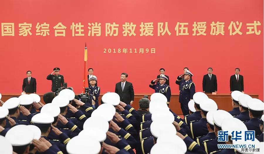 2018年11月9日,國家綜合性消防救援隊伍授旗儀式在人民大會堂舉行。中共中央總書記、國家主席、中央軍委主席習(xí)近平向國家綜合性消防救援隊伍授旗并致訓(xùn)詞。